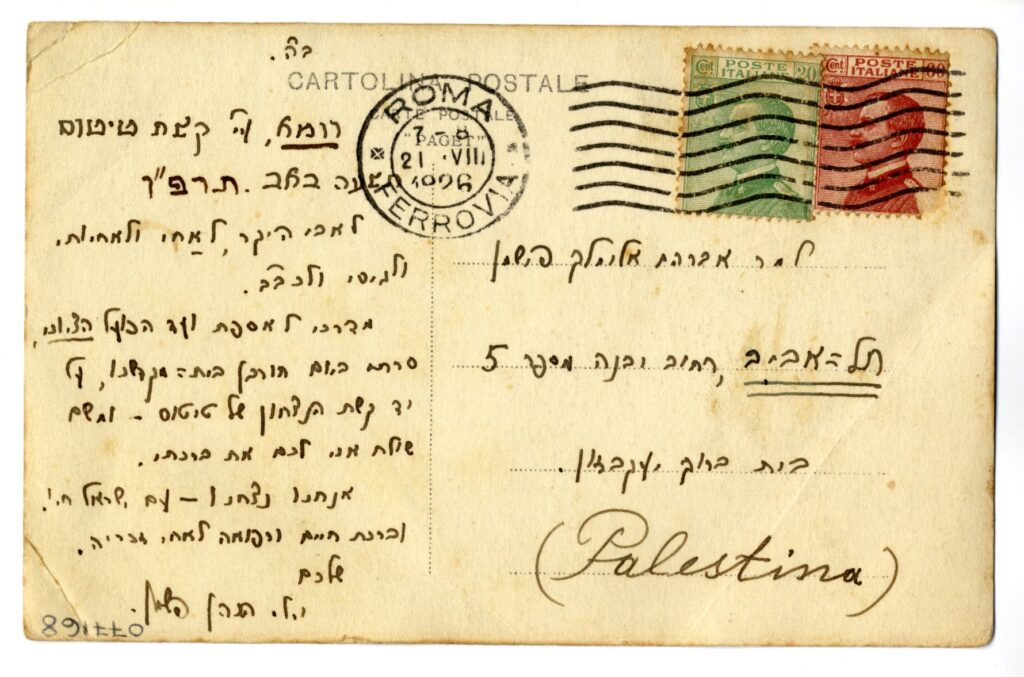A display of pride in Jewish endurance, despite the destruction and sacking of the Temple, is reflected in this photo postcard penned by Rabbi Judah Leib Fishman Maimon on 9 Av 1926 [July 20, 1926] in Rome and sent to his father in Tel Aviv the following day.